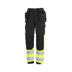 Bukse i full stretch for maksimal komfort og bevegelighet. Materialet er lett vannavvisende. Flyttbare og avtagbare hengelommer, smart løsning for venstrehendte. Hengelommer med plass til verktøy og blyanter. Venstre hengelomme har ekstra sikkerhetslomme med glidelåslukking. D-ring, nøkkelring, ID-kortholder i venstre benlomme. Doble hammerholdere, samt borrelåshempe for feste av hammerholder. Side- og baklommer. Tommestokklomme, knivknapp, pennelomme på høyre ben. Stor benlomme med glidelås og mobillomme på venstre ben. Forsterkning i polyamid på utsatte steder. Midjejustering for best passform. Knebeskytterlommer for korte og lange knebeskyttere. Varselsertifisering.