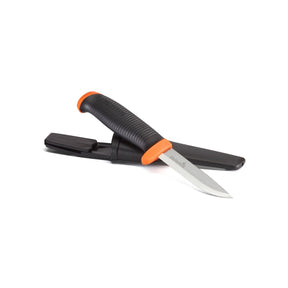 Vår klassiske håndverkskniv med friksjonsgrep som forhindrer at kniven sklir ut av hånden og gir et fast grep. Denne allsidige kniven er skarp og sterk for å møte håndverkerens behov. Knivbladet er 2,5 mm tykt og herdet til 58-60 HRC. Eggen er slipt i flere operasjoner, skaft og slire produsert i holdbart PP-plast.