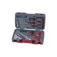Pipe-/verktøysett som inneholder fiberforsterket skrallehåndtak, universalledd, forlengerstenger 75 og 150 mm, bitspipe, reduksjonstapp 1/2''- 3/8'', bitsskrutrekker med magnet, 14 stk sekskantpiper, 10 stk kombinasjonsnøkler, 6 stk skrutrekkere, 4 stk tenger samt 26 stk bits.