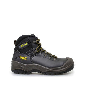 For tøffe arbeidsforhold i bygg og anlegg, mekanisk industri og annet utendørs arbeid. Overdel i kraftig vannavtøtende oksehud med Cordura detaljer. Cambrellefôr innvendig. Ankelpolstring. Polstret toppkant og pløse. 2-sjikts såle: Nitril yttersåle og mellomsåle i mykt PU materiale, oljebestandig og antistatisk. Varmebestandig såle +300°C (HRO). Uttagbar innleggssåle. Sklihemmende egenskaper på keramiske fliser og stålunderlag (SRC). PU tåforsterkning. Support System med ekstra utvendig hælkappe gjør skoen stødig, og reduserer muligheten for å trå over i ujevnt terreng. Vekt 767 gram (1 stk str. 42). Tåvernhette og spikertrampsåle i stål.