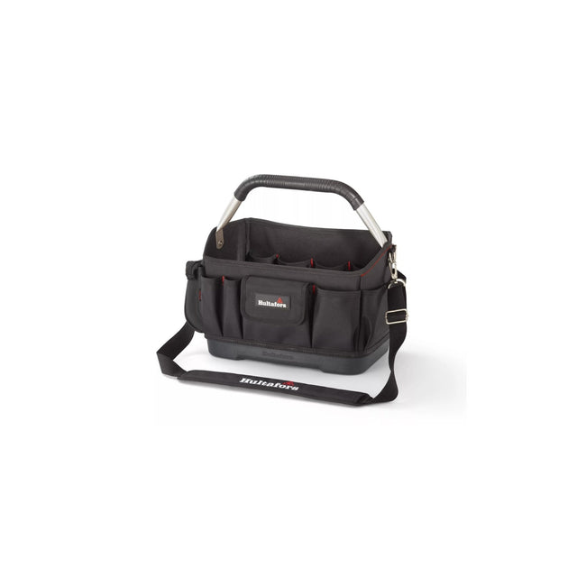 Dette er en åpen verktøykasse med myke sider, designet for ergonomisk bæring. Baksiden av vesken har en ergonomisk kurve som gir beinet bedre plass til å bevege seg, og du trenger ikke å holde vesken langt unna kroppen når du går. Den har også en robust støpt bunn som hindrer vesken i å velte, beskytter mot fukt, smuss og slitasje - og holder verktøyet tørt. Vesken er laget av ekstremt slitesterk ballistisk polyester - 1680 denier - for maksimal slitestyrke og levetid. Forsiden og baksiden av vesken har ulike høyder, noe som gir deg god oversikt og tilgang forfra og mer støtte for verktøyet ditt på baksiden. Den har et stort midtrom, foret med lommer og verktøyholdere. Det finnes mellomstore lommer med lokk og glidelåser for sikker oppbevaring av sensitivt utstyr. Den har også målebåndholder, penneholdere, nøkkelringholder og elastiske løkker for mindre verktøy. En av sidelommene inneholder regn- og støvdeksel. Den er laget av et revnesikkert stoff og beskytter vesken og innholdet mot dårlig vær, støv og smuss. Håndtaket er ekstra høyt, noe som gjør det lettere å nå ned i og ta tak i vesken. Det har et langt gummibelegg slik at du kan gripe komfortabelt langs hele håndtaket og balansere en ujevnt lastet veske. Håndtaket foldes bort for enkel tilgang og oversikt. Den justerbare skulderstroppen har en ekstra lang polstring med en sklisikker overflate for komfortabel og enkel transport.