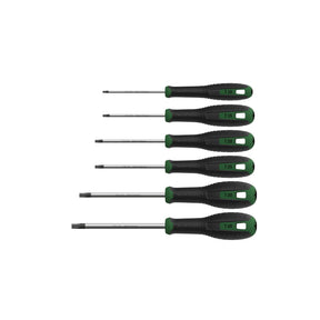 Torx® skrutrekkersett med 6 av de vanligste størelsene, utviklet for profesjonelt bruk sammen med håndverkere. Inneholder T 10, 15, 20, 25, 30 og 40. Ergonomisk design for optimal komfort. Det lange gummibelagte håndtaket gir et godt grep når det kommer til presisjon og maksimal kraftoverføring. Håndtaket er laget av slitesterk PPC-plast med et lag av holdbar og grepsvennlig gummi på oversiden. Den permanente merkingen av type og størrelse på toppen, samt håndtakets farge, gjør det enkelt å velge riktig skrutrekker. Klingen er produsert av herdet stål av høy kvalitet for lang levetid. Håndtaket på skrutrekkeren har et hull for oppheng eller sikring av verktøyet, og utformingen på håndtaket forhindrer at skrutrekkeren ruller på skrå flater.