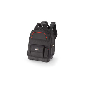 En ergonomisk, kraftig, allsidig verktøyryggsekk med en robust støpt bunn. Den støpte bunnen hindrer vesken i å velte, beskytter mot fukt, smuss og slitasje - og holder verktøyet ditt tørt. Vesken er laget av ekstremt slitesterk ballistisk polyester - 1680 denier - for maksimal slitestyrke og levetid. Den har to store rom med glidelåser som kan åpnes helt. Dette gjør at du kan folde yttersiden helt ned, noe som gir deg maksimal oversikt og tilgang. Det ytre rommet er foret med mange lommer og verktøyholdere. Vekslende rødt og svart stoff gjør det lettere å skille forskjellige verktøy og lommer fra hverandre. Rommet nærmest ryggen har en polstret lomme for bærbar PC, nettbrett og dokumenter. Det passer til bærbare datamaskiner opptil 15". Den har mellomstore lommer med lokk og glidelåser for sikker oppbevaring av sensitivt utstyr, gjennomsiktige lommer som gjør det enkelt å finne det du leter etter og en ekstern vannflaskelomme på venstre side av vesken. Den har også målebåndholder, pennholdere, nøkkelringholder og elastiske løkker for mindre verktøy. De justerbare skulderstroppene har en sklisikker overflate og en 3D-form som følger kroppens linjer for optimal ergonomisk bæring. Både baksiden av vesken og skulderstroppene har ventilert polstring for kjølig og komfortabelt arbeid. På toppen av vesken finner du to komfortable gummihåndtak, de lar deg enkelt brette opp baksiden og fronten når du raskt må flytte vesken. Glidelåsene er av nylon – veldig slitesterke med store g...