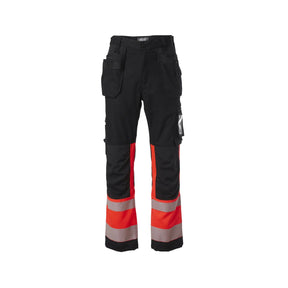 Håndverksbukse med stort stretchparti over baken for økt bevegelighet og komfort. Forbøyde knær og knebeskyttelseslommer med to nivåer. Forsterkning med cordura materiale over knærne. Forsterkede baklommer, to hammerholder og mobillommer. Mulighet for å legge bort hengelommer inne i linningen. Forsterkning i enden av bena og 5 cm ekstra ferdigfylt benlengde som er lett å brette ned. EN ISO 20471 klasse 1. OEKO-TEX®-certifisert.