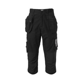 Piratbukser med paneler i 4-veis stretch over baksiden for maksimal bevegelsesfrihet. Knelommer med slitesterk forsterkning og mulighet for to forskjellige nivåer av knebeskytterne. Forbøyde knær og reflekskompasstenger for økt synlighet. To forsterkede hengelommer med plass til forskjellige verktøy og en tett lomme. To sidelommer, to baklommer og doble hammerholder. En tommestokklomme med knapp og holder for kniv. En benlomme med glidelås, mobillomme, pennelommer og en ID-kortlomme.