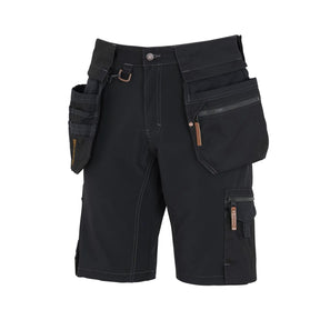 Shorts i et helstretch smidig materiale. Forsterkninger på lommer. Flyttbare og avtagbare hengelommer, smart løsning for venstrehendte. Knepping i gylf. Sikkerhetslomme med glidelås på venstre hengelomme. D-ring på begge hengelommer. Nøkkelbånd. Doble hammerholdere, samt borrelåshempe i linning for feste av hammerholder (art. 331166). Lårlomme med knivknapp, tommestokklomme, mobiltelefonlomme, pennelomme, glidelåslukking på venstre lårlomme. Synlig ID-kortlomme.