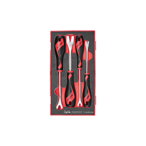 Dette 4-delers settet fra TengTools er utviklet for å muliggjøre skånsom demontering av festeelementer og klips på paneler og lister. Hvert verktøy i settet har en spiss som er formet for å gi god hevstangseffekt samtidig som det minimerer risikoen for skader på panel eller list. Settet er kompatibelt med de fleste standardklips og er designet for å fungere i trange rom, noe som gjør det til en allsidig ressurs i verkstedet. De ergonomiske håndtakene er laget av et to-komponentsmateriale og har hull for oppbevaring eller verktøysikringswire, noe som øker både komfort og sikkerhet under bruk. Verktøyene leveres i en verktøymodul størrelse 1 (FOAM1) og kan brukes alene eller integreres i ditt eksisterende verktøyoppbevaringssystem fra TengTools.